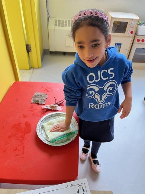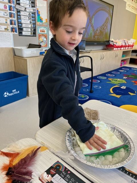 Over the last week, SK has been exploring and discussing how animals get ready for winter. Through books, videos, songs and crafts, they have learned that some animals adapt, some migrate, and some hibernate in order to survive the winter months. Today, they experimented with Fat (vegetable shortening in a baggie), Fur (faux, of course!) and Feathers to see which kept their hands the warmest when touching ice. The students were so engaged and enthusiastic as they tried different combinations to see which would keep their hands warm…. the combo of fat (blubber) and fur was the clear winner!! Check out the photos below from the experiment…